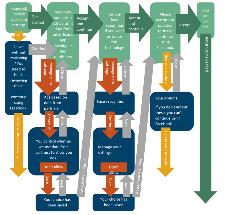 With the digital world still lacking a lot of regulation, many independant watch dog websites have been set up to study, monitor, and call out Dark UX Patterns. In a report from forbrukerradet.no, it was found that Facebook and Google were guilty of purposely making their privacy flows easier for the options they wish users to take: